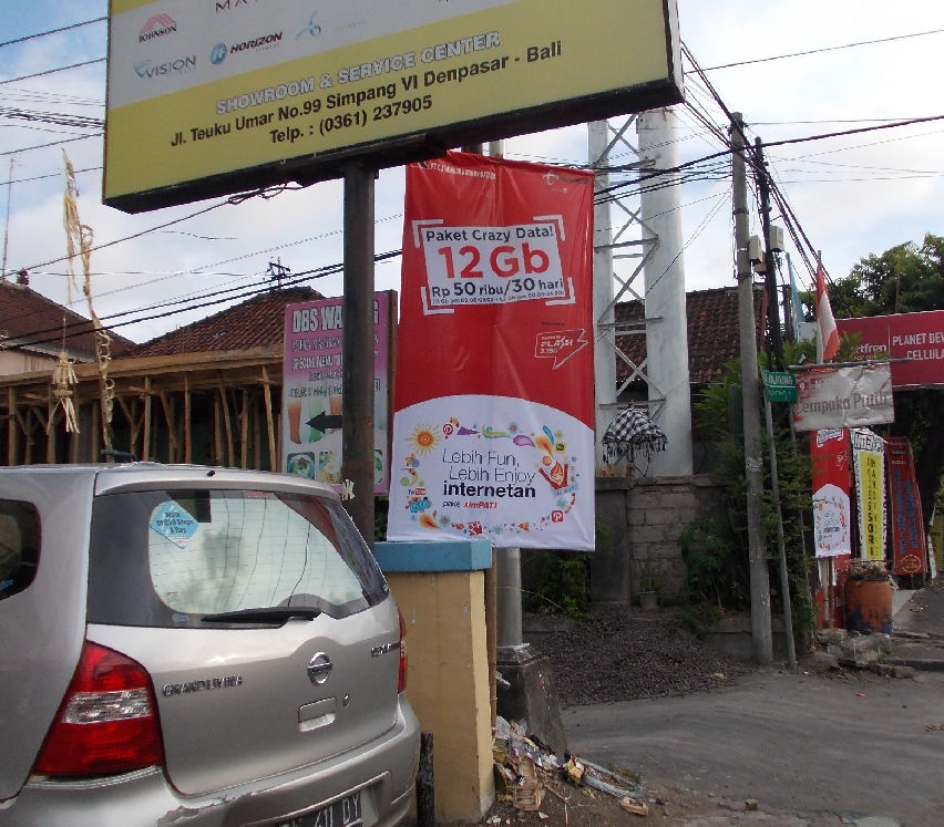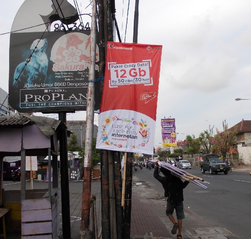 T Banner ini dipasang di seputaran Teuku Umar Denpasar untuk branding produk terbaru. Dipasang dengan menggunakan bambu sebagai media penyangga. More Info Available Price