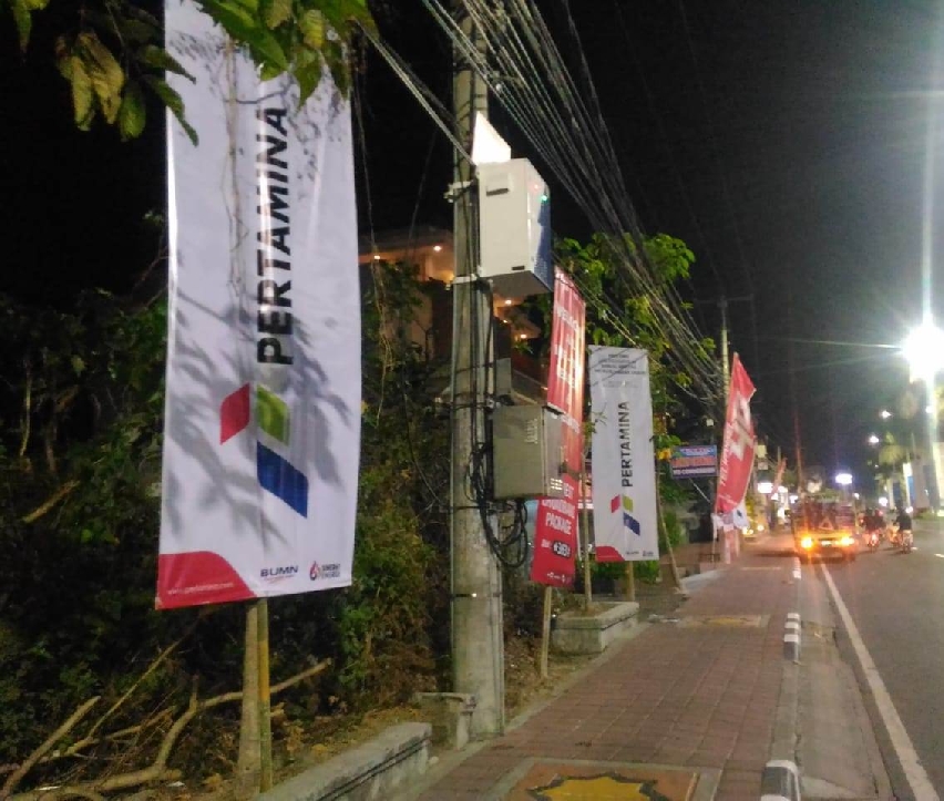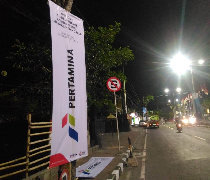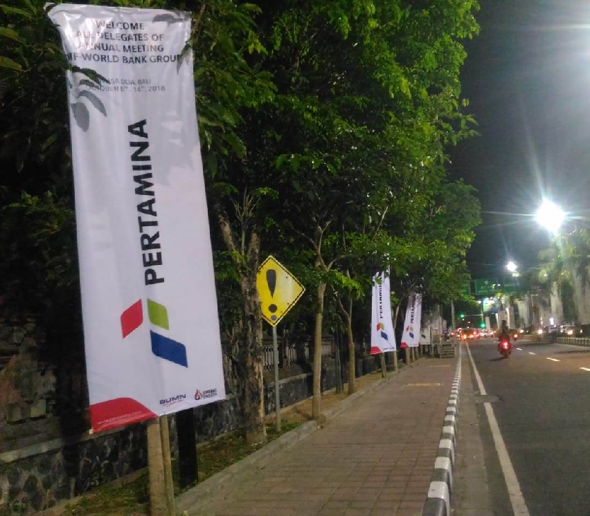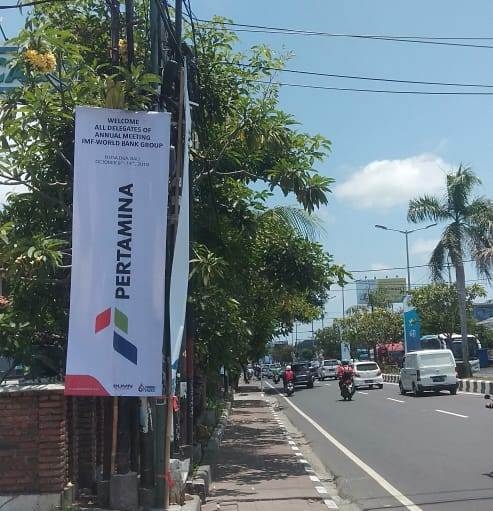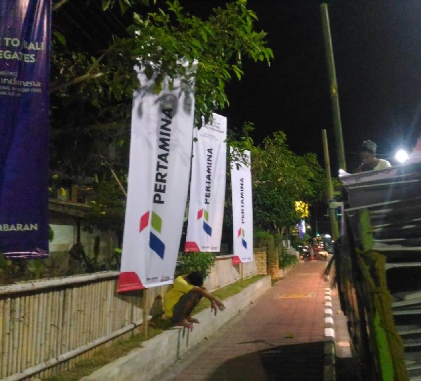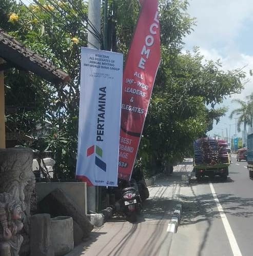 T banner pertamina menggunakan penyangga bambu. Selain digunakan sebagai alat branding, t banner juga bisa digunakan sebagai media penyambutan. Dalam rangka menyambut event IMF, Pertamina menggunakan t banner yang dipasang di sepanjang By Pass Ngurah Rai.