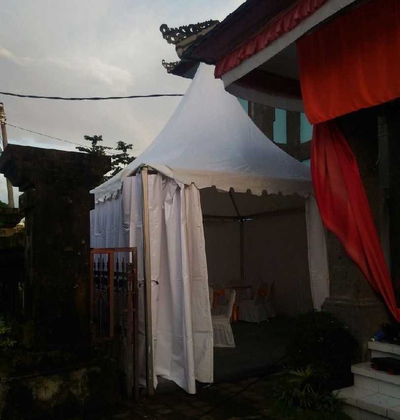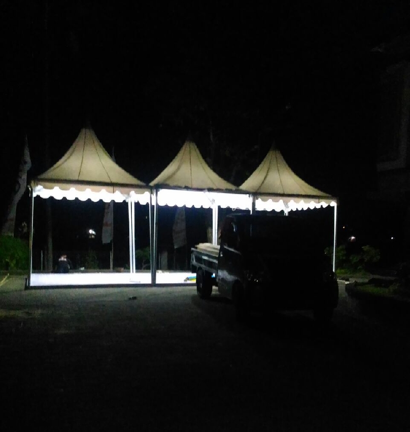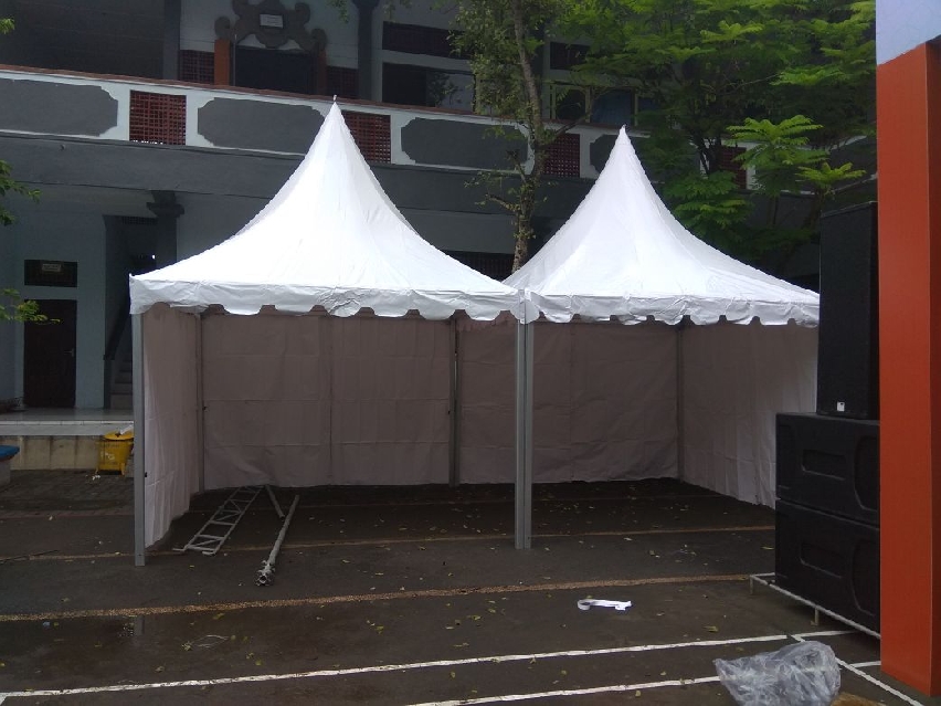 GNG menyewakan tenda berukuran 3x3 dengan berbahan aluminium. Cover tenda putih polos dengan bentuk kerucut dan umumnya digunakan untuk memeriahkan event.